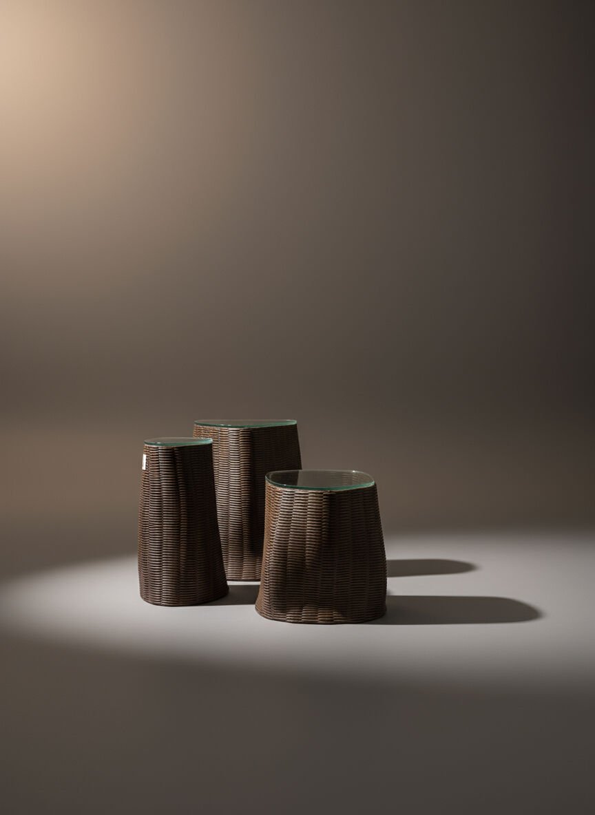 Her bir sehpa, kendine özgü akışkan formu ve örgü hissi veren yüzey dokusuyla dikkat çeker.