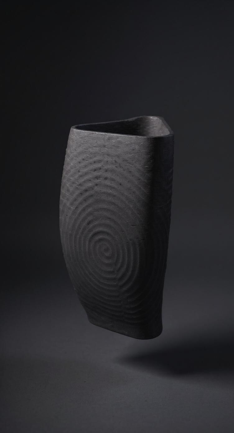 Bu vazo, 3D seramik yazıcıyla oluşturulan dairesel yüzey dokusuyla güçlü ve minimal bir estetik sunuyor. Beton görünümlü gri yüzeyi, modern mimarinin sadeliğini yansıtırken formdaki spiral hareket zamansız bir karakter katıyor.
