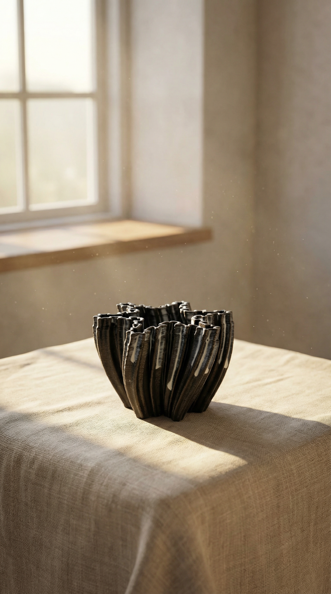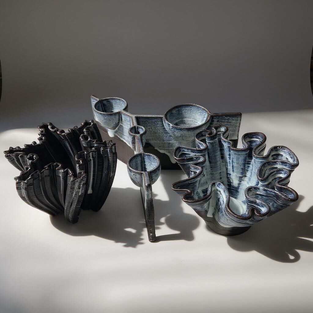 Seramiklerimizin formları, kendi stüdyomuzda tasarladığımız 3D kil yazıcısı kullanılarak milimetrik hassasiyetle şekillendiriliyor; yüzeyde gördüğünüz her katman, el yapımı sanatçılığın ince izlerini taşıyor.