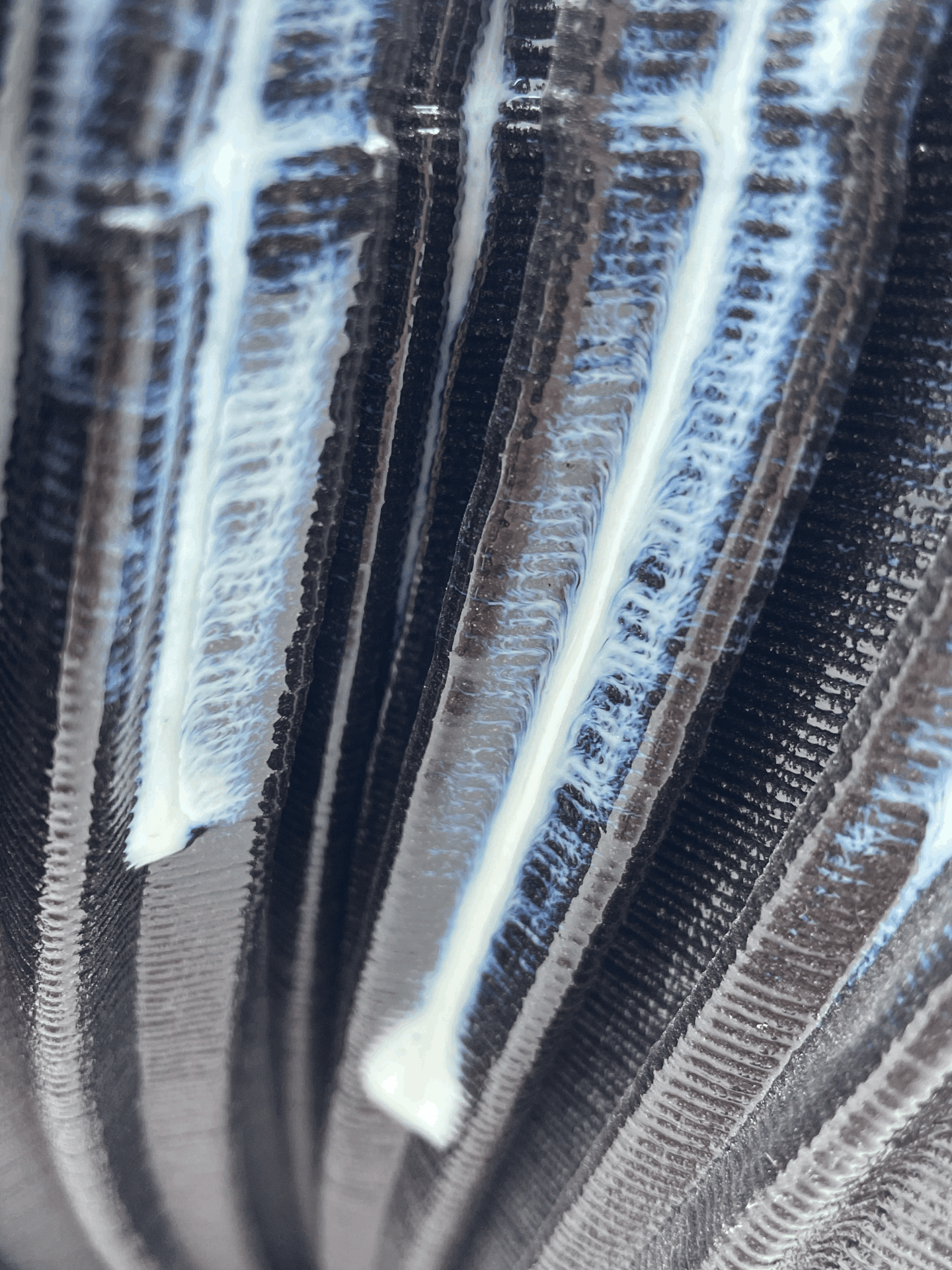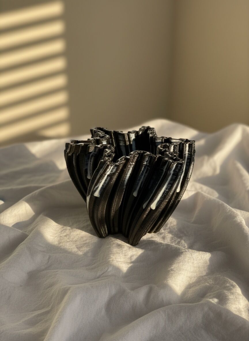 Bu vazo, 3D seramik yazıcıyla oluşturulan dinamik dalga formuyla güçlü ve modern bir karakter taşır. Parlak siyah yüzeydeki akışkan beyaz efektler, formun hareketini vurgularken ışıkla birlikte derinlik kazandırır.