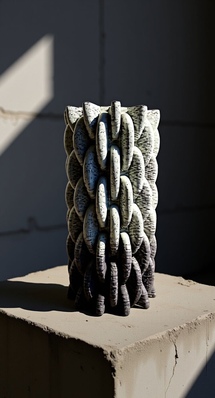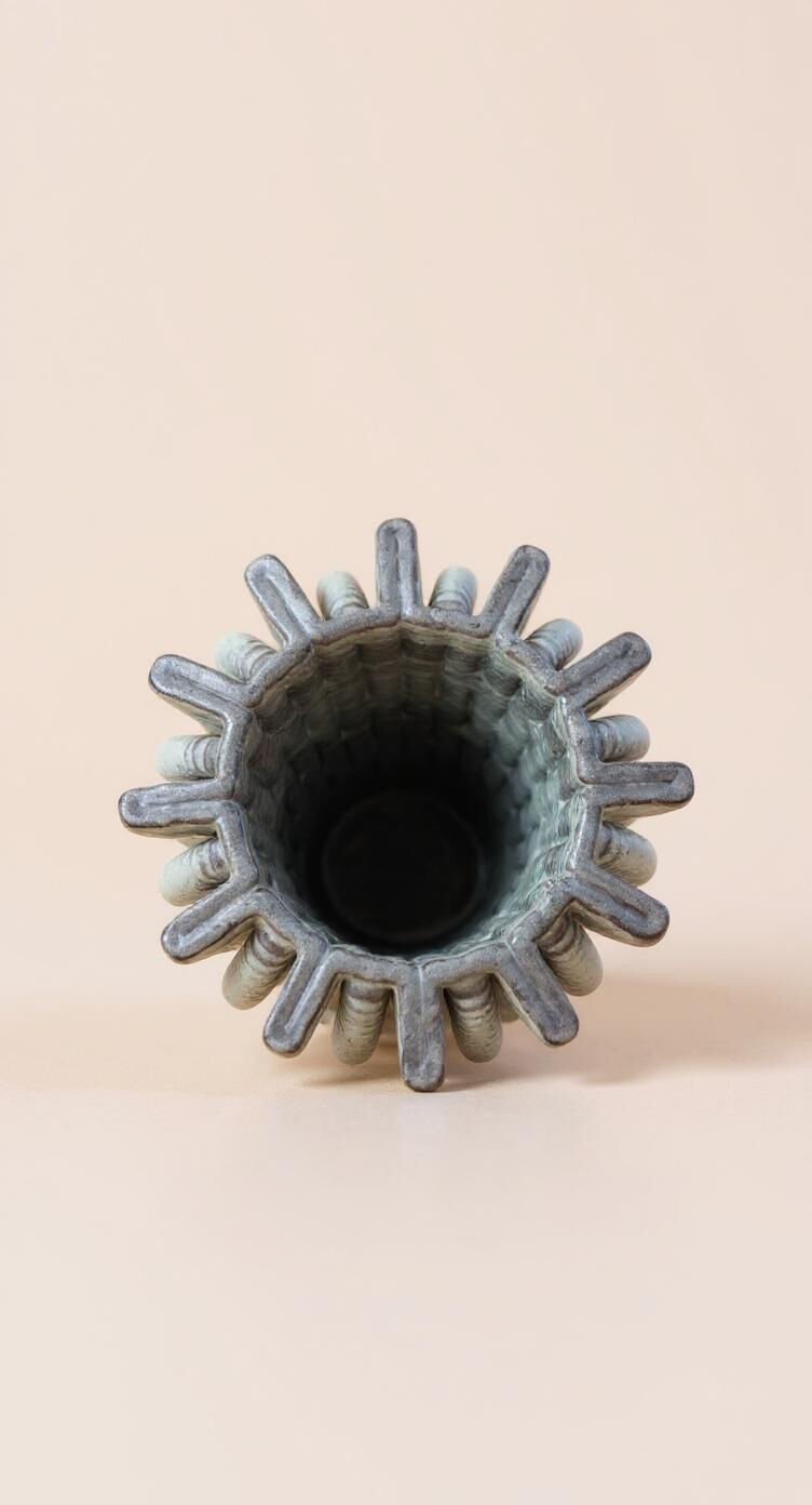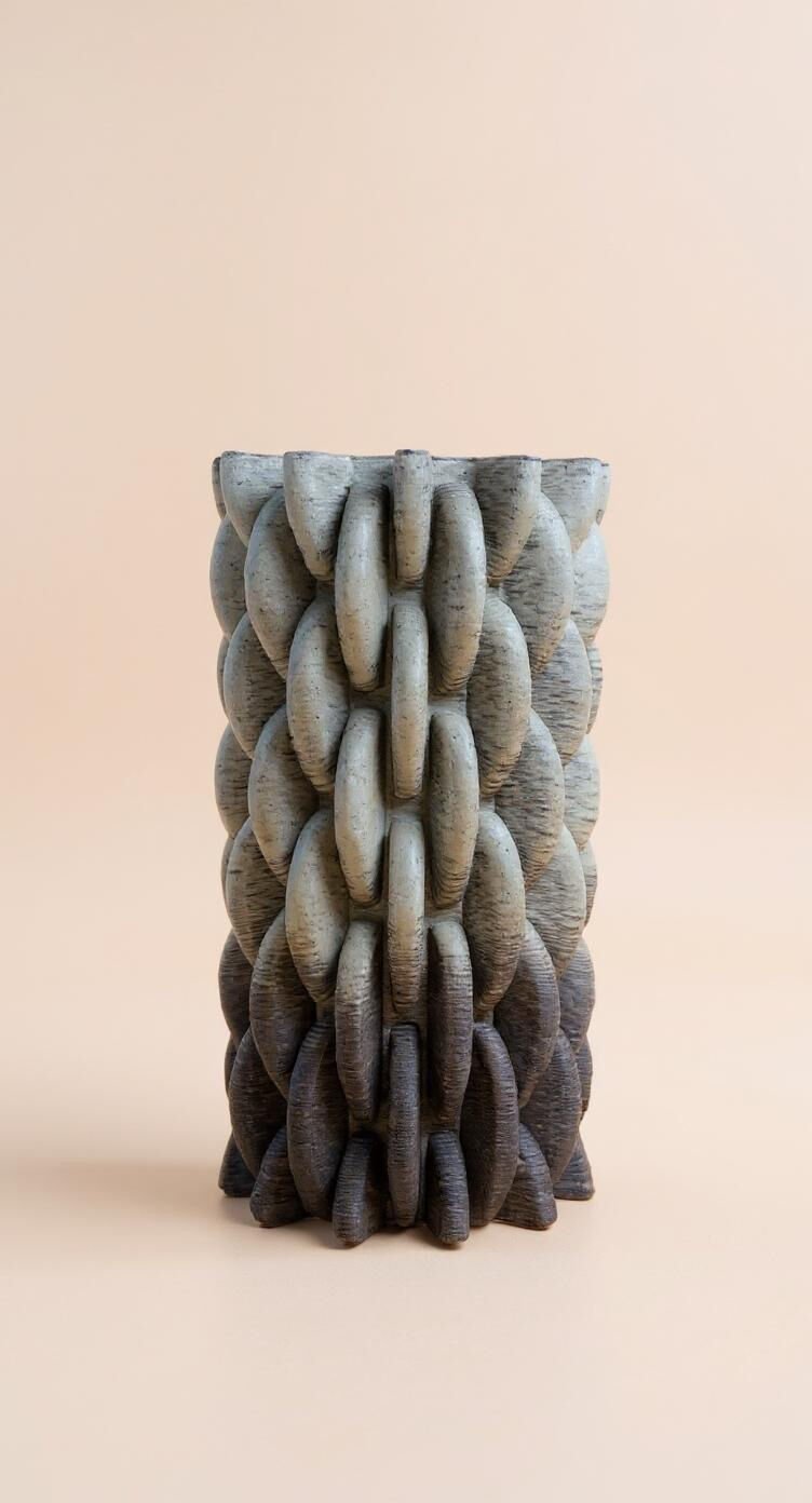 Heykelsi bir form diliyle tasarlanan bu seramik vazo, üst üste eklenmiş dairesel halkaların oluşturduğu dokusuyla dikkat çeker. 3D yazıcı teknolojisiyle üretilen form eşsiz bir karakter kazanmıştır.