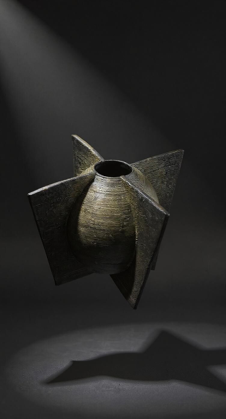 Bu vazo, merkezde yer alan yumuşak gövdeyi çevreleyen keskin panelleriyle tamamen heykelsi bir yapı sunuyor. 3D seramik yazıcıyla üretilen yüzey dokusu, ışık altında dramatik bir derinlik oluştururken geometrik düzen ve organik form arasında güçlü bir denge kuruyor.