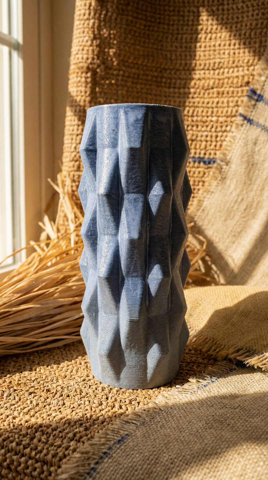 Bu vazo, 3D seramik yazıcıyla oluşturulmuş kristalimsi geometrik bir yüzeye sahip. Mavinin farklı tonlarında hareket eden yüzey, ışıkla birlikte derinleşen doğal bir parlaklık yaratıyor. Hem modern hem de organik his taşıyan formu sayesinde mekanlarda güçlü bir dekoratif vurgu oluşturur.