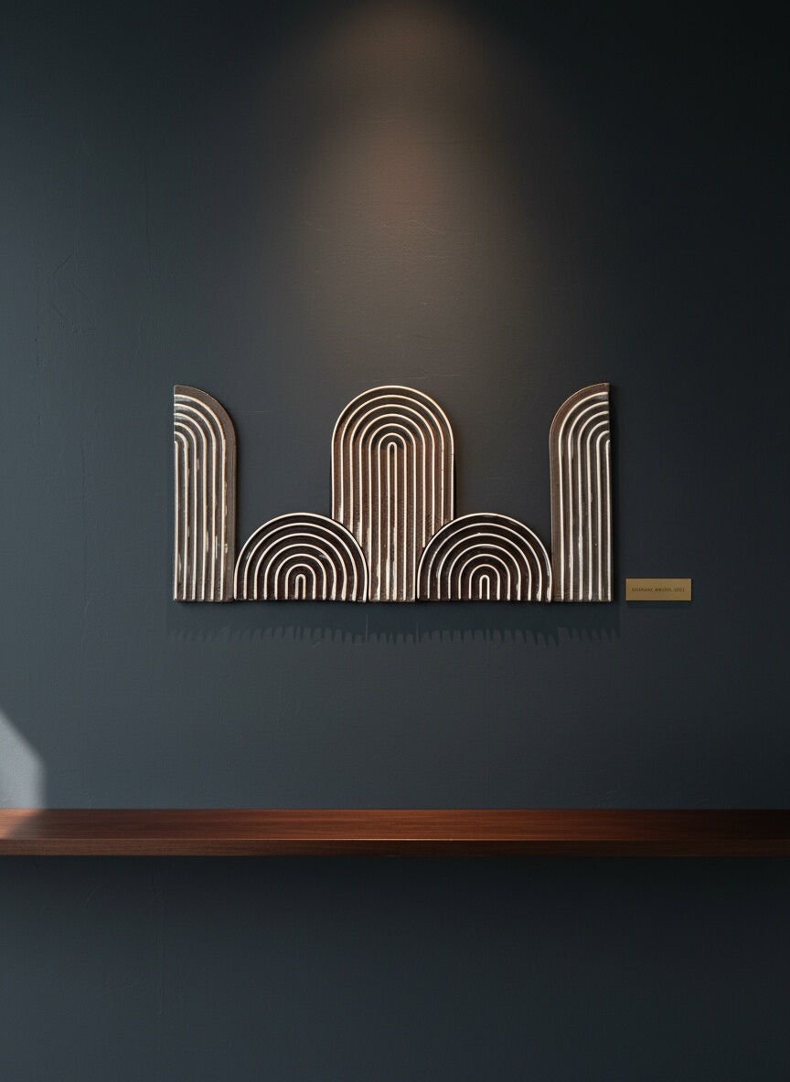 Bu tablo, seramiğin heykelsi doğasını geometrik bir kompozisyona dönüştürerek mekânın atmosferini güçlendirir.