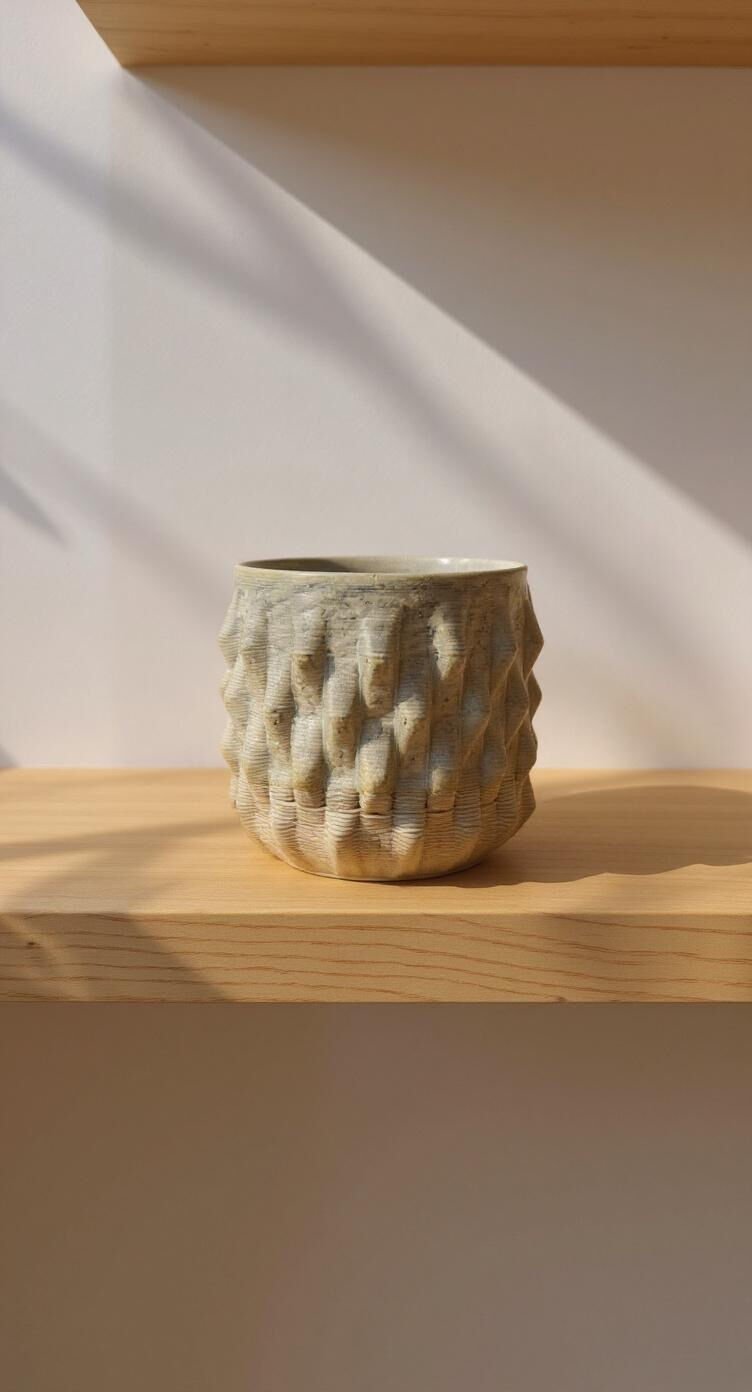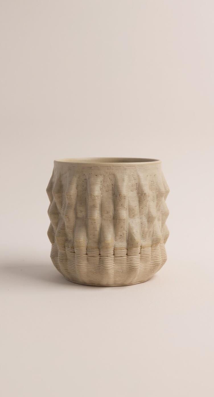 Doğal dokusu ve modern formuyla öne çıkan bu seramik bardak, 3D yazıcı teknolojisiyle üretilmiştir. Katmanlı yüzey detayı, tasarıma hem dokunsal hem de görsel bir derinlik kazandırır.
