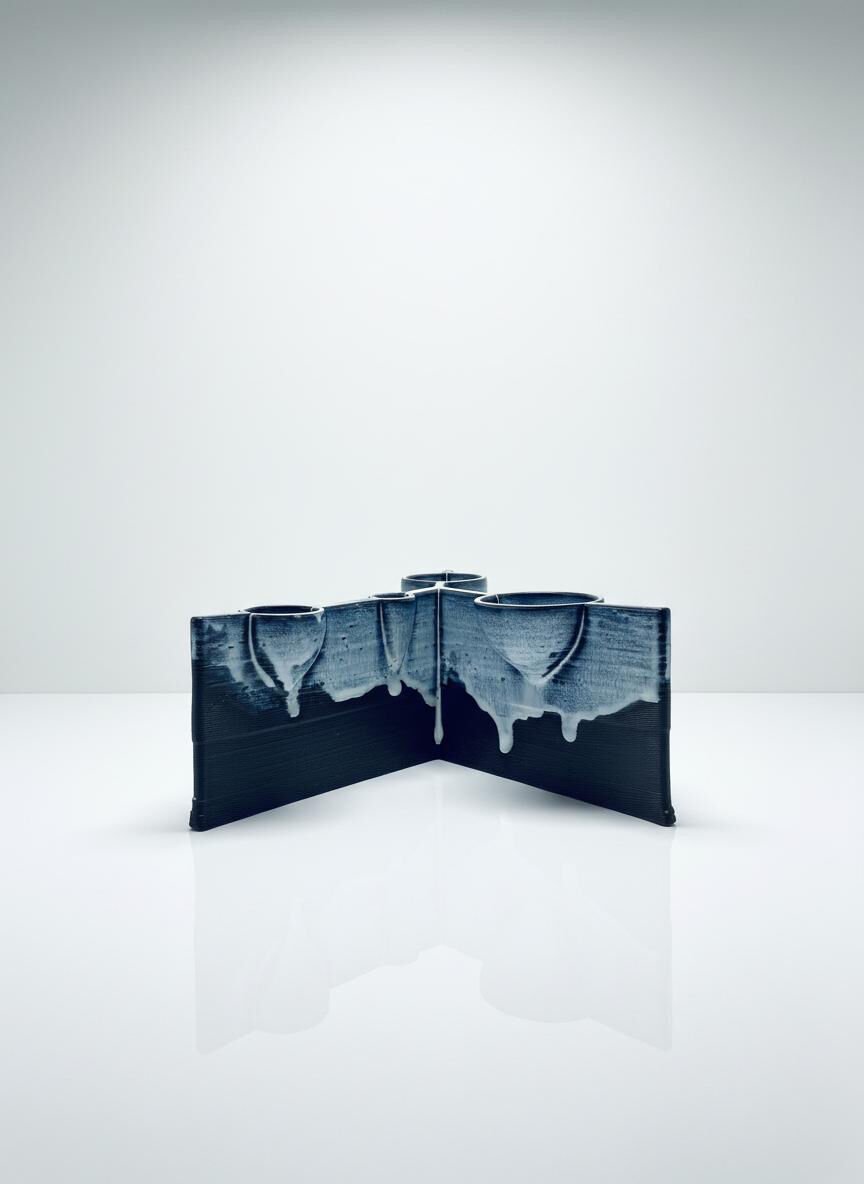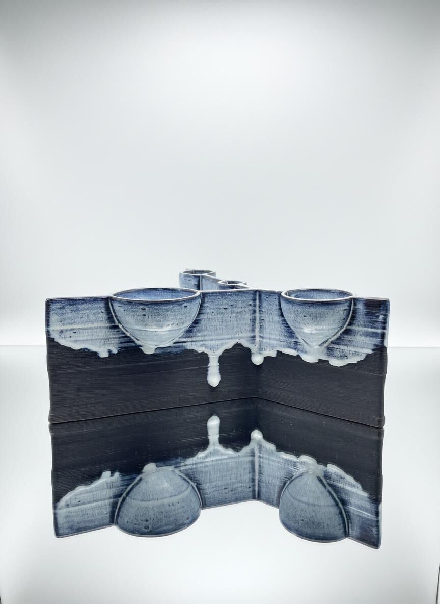 Minimalist tasarımın modern çizgilerle buluştuğu bu 3D baskı seramik saksı, özellikle sukulent ve kaktüsler için tasarlanmıştır. El işçiliği dokunuşlarıyla öne çıkan parça, mavi-beyaz sırın siyah yüzeyde oluşturduğu akış efekti sayesinde özgün bir görsellik sunar.