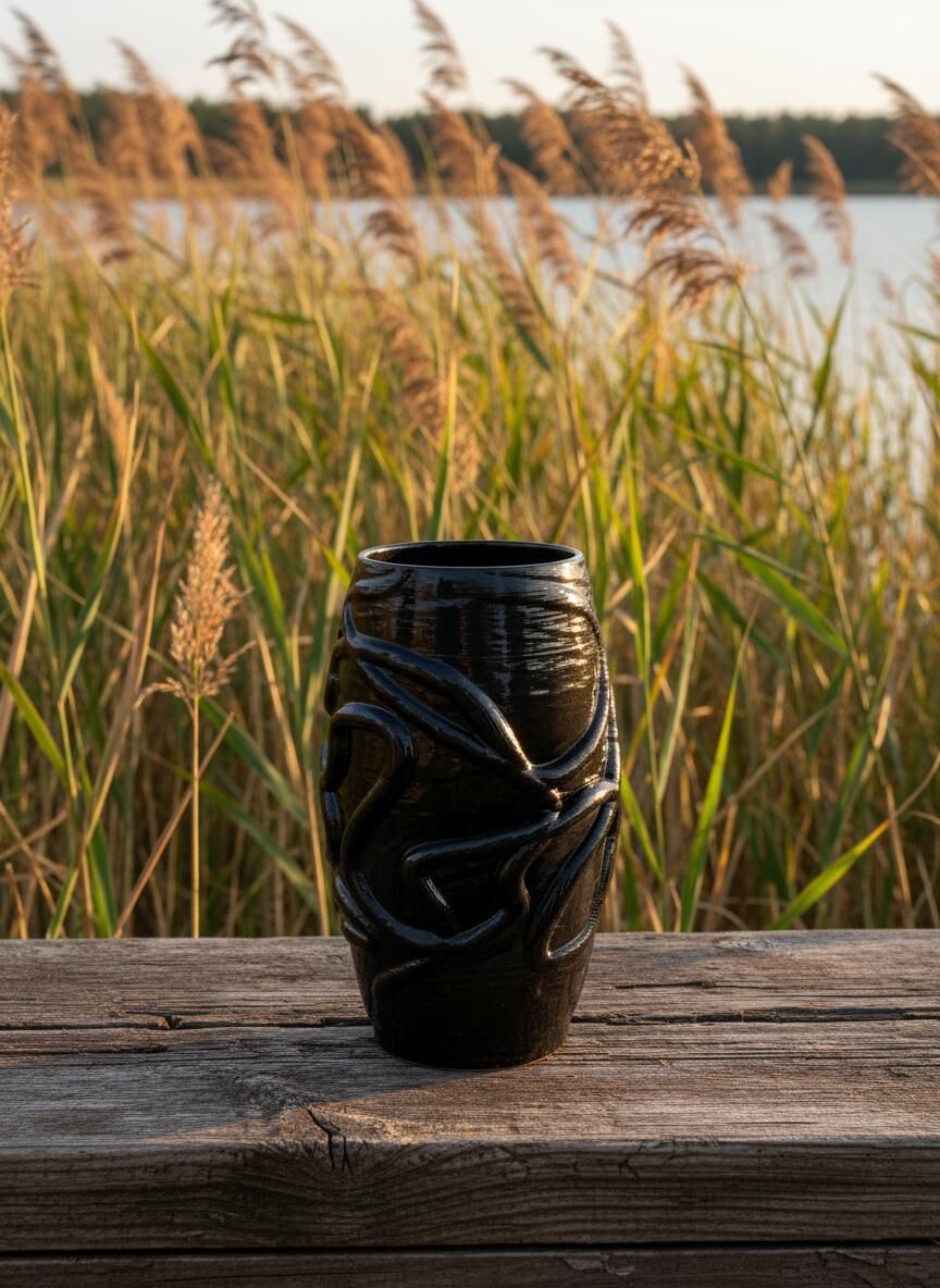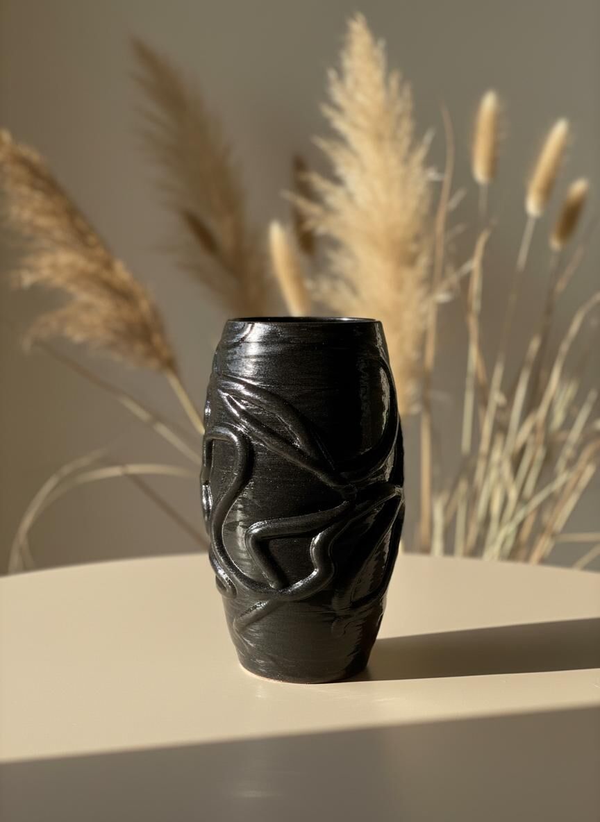 Bu vazo, 3D seramik yazıcıyla oluşturulan akışkan hatlarıyla güçlü ve modern bir ifade taşır. Gövde boyunca ilerleyen organik kabartmalar, ışıkla birlikte derinleşen heykelsi bir hareket yaratır. Parlak siyah yüzeyi, formun dinamizmini öne çıkarırken mekânda sofistike bir vurgu oluşturur.