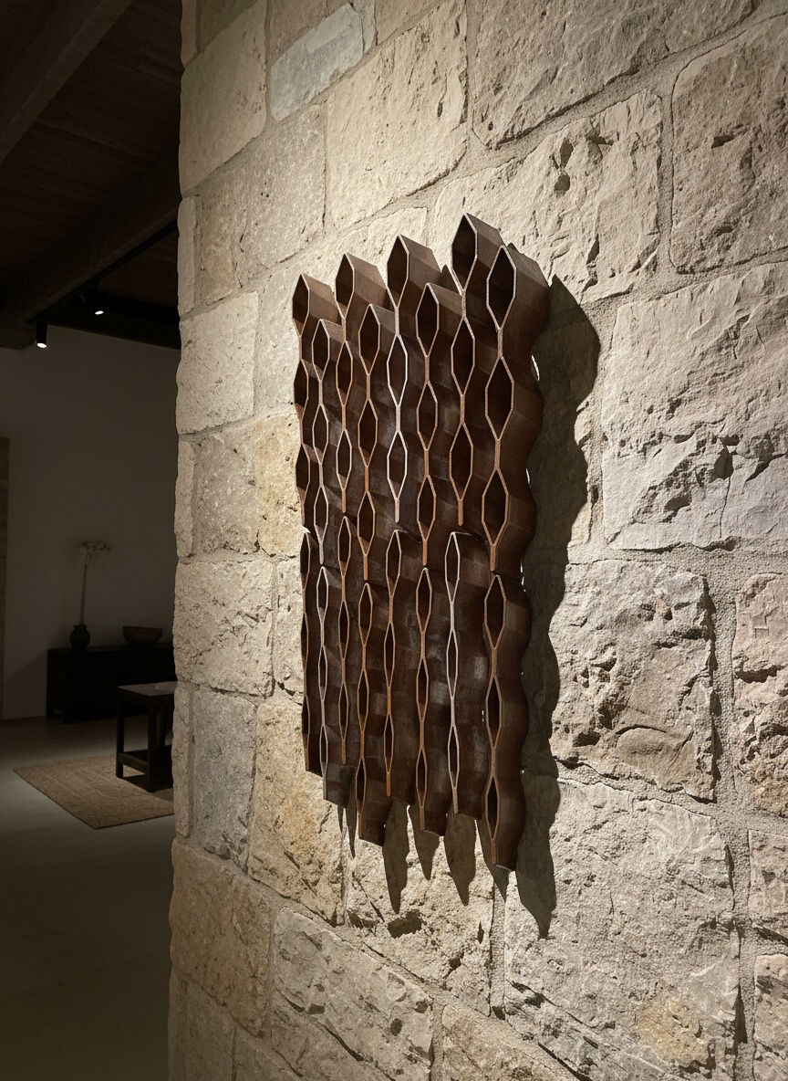 Hücresel formu sayesinde ışık ve gölgeyle etkileşime girerek duvarda dinamik bir doku oluşturur.