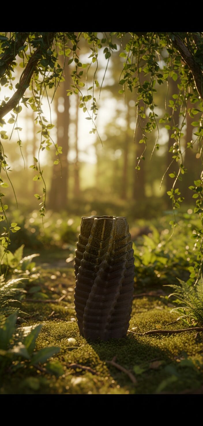 Yüzeyindeki dalgalı form, ormanın içinde yetişen bir kabuğu ya da toprağın kendi çizgilerini hatırlatıyor. Işık her bir kıvrıma vurdukça vazo farklı bir derinlik kazanıyor.
